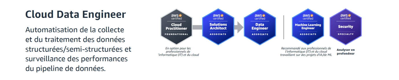 La certification Cloud Practitioner, en option pour les professionnels IT déjà établis, constitue une base solide pour tous les profils débutants. Présent dans chaque parcours (pour chaque métier), nous ne le mentionnons donc pas systématiquement.